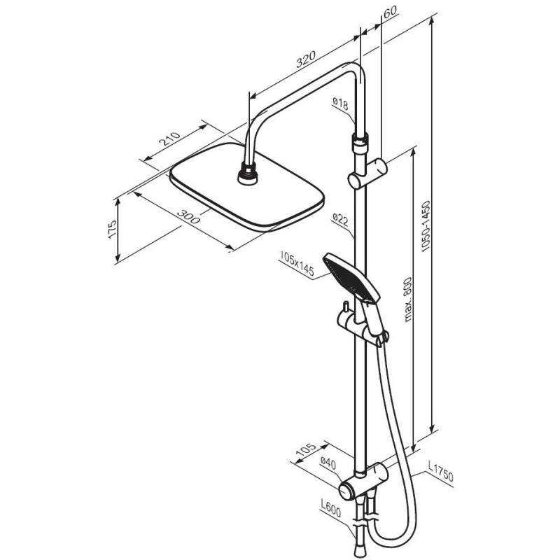 - Монолитный душевой шланг длиной 1750 мм, 600 мм.