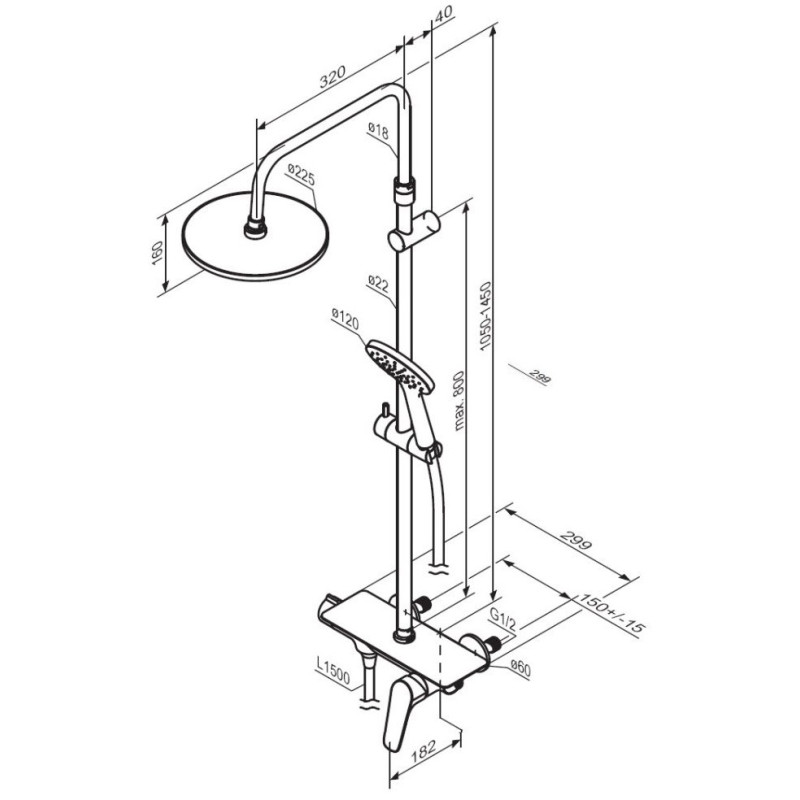 - Высота душевой штанги: 1050-1450 мм.