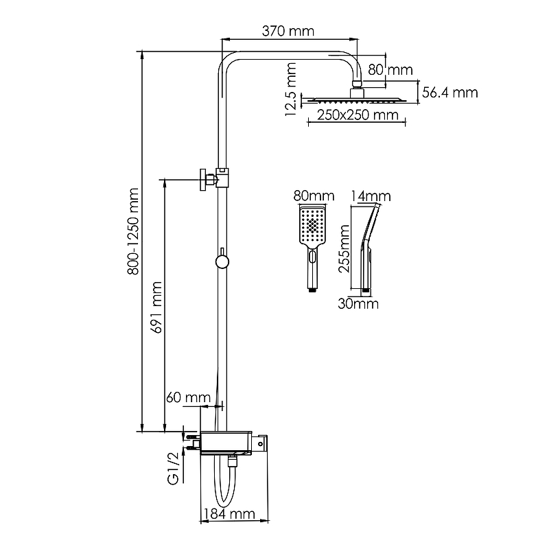 - Верхний душ: 250х250 мм, 112 форсунок, нержавеющая сталь.