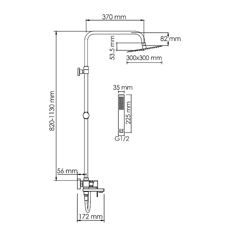 <li>Верхний душ: 300х300 мм, 196 форсунок, нержавеющая сталь.</li>