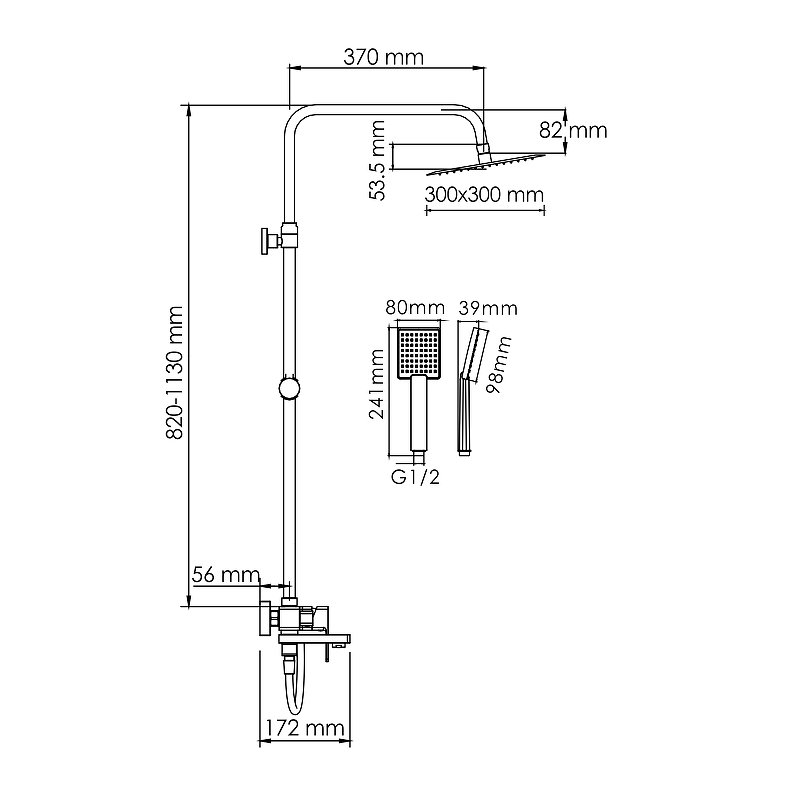 <li>Верхний душ: 300х300 мм, 196 форсунок, нержавеющая сталь.</li>