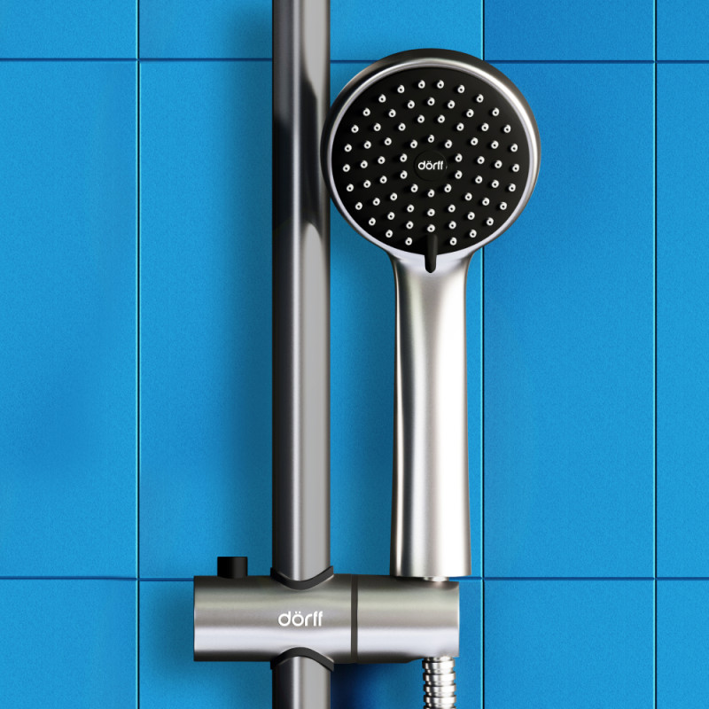Душевая система Dorff Logic D0703000SS - очень практичный и удобный в использовании благодаря шлангу с защитой от перекручивания и функции регулировки по высоте, к тому же выглядит очень стильно.