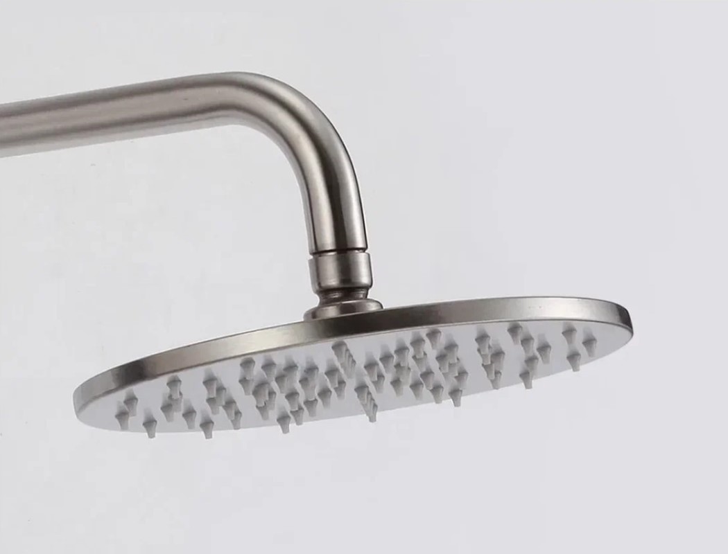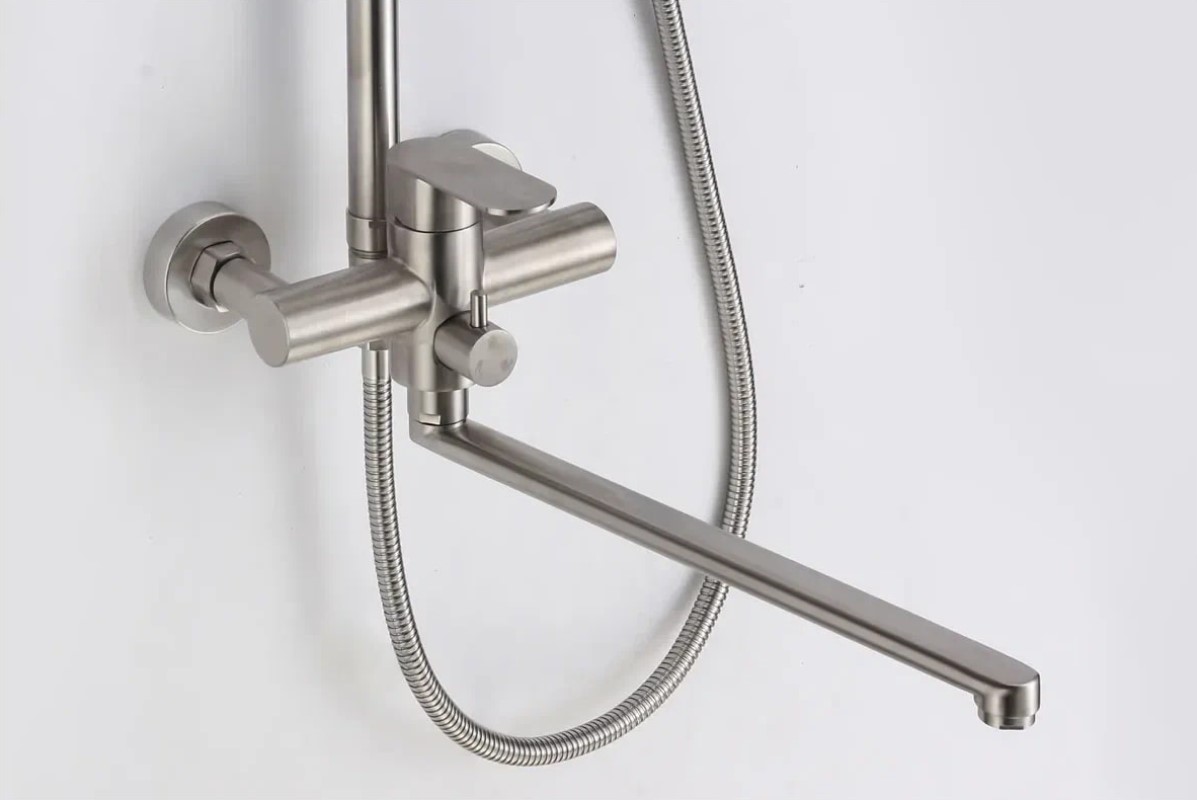 Душевая система D-Lin. Изготовлена из высококачественной нержавеющей стали. Тропический душ круглой формы имеет оптимальный размер 20х20 см., легко очищается благодаря силиконовым форсункам. Длинный поворотный излив для наполнения ванны. Душевая штанга регулируется по высоте на 47 см.
