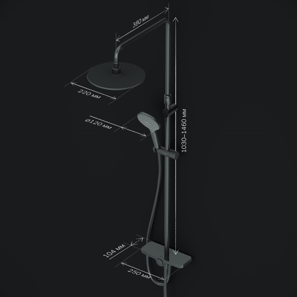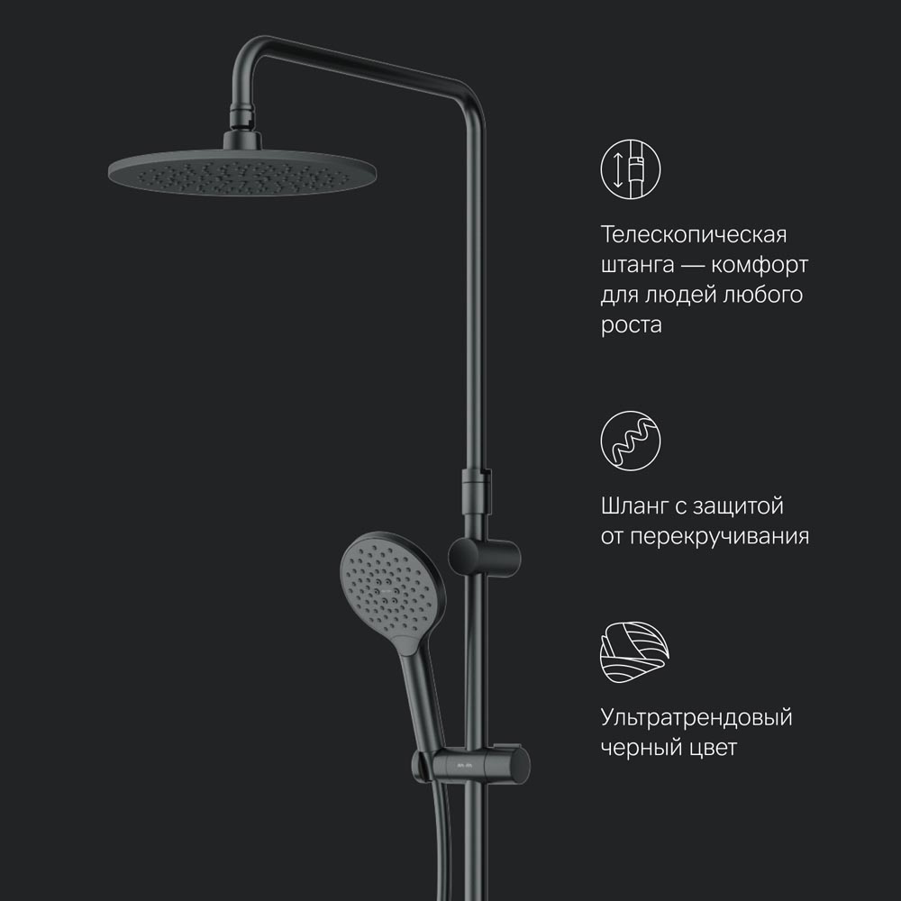 Премиальные размеры и продуманные детали: увеличенный диаметр душевых леек (верхний душ 220 мм и ручной душ 120 мм) позволит ощутить преимущества тропического душа тогда как увеличенная длина шланга 1750 мм обеспечит свободу движений во время принятия душа. Телескопическая поворотная штанга регулируется по высоте в диапазоне от 1030 до 1460 мм обеспечивая комфорт для людей любого роста а шаровой шарнир в держателе верхнего душа позволяет регулировать угол его наклона.