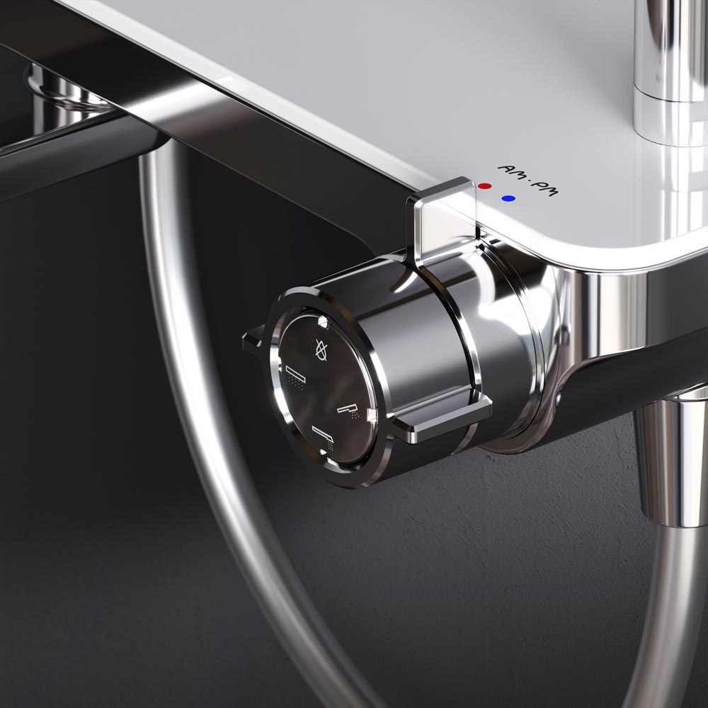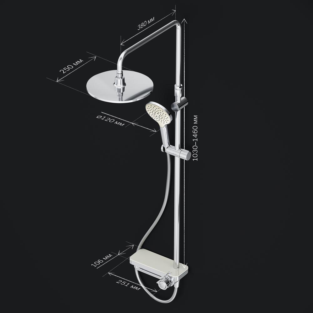 Премиальные размеры и продуманные детали: увеличенный диаметр душевых леек (верхний душ 254 мм и ручной душ 120 мм) позволит ощутить преимущества тропического душа тогда как увеличенная длина шланга 1750 мм обеспечит свободу движений во время принятия душа. Телескопическая поворотная штанга регулируется по высоте в диапазоне от 1030 до 1460 мм обеспечивая комфорт для людей любого роста а шаровой шарнир в держателе верхнего душа позволяет регулировать угол его наклона.