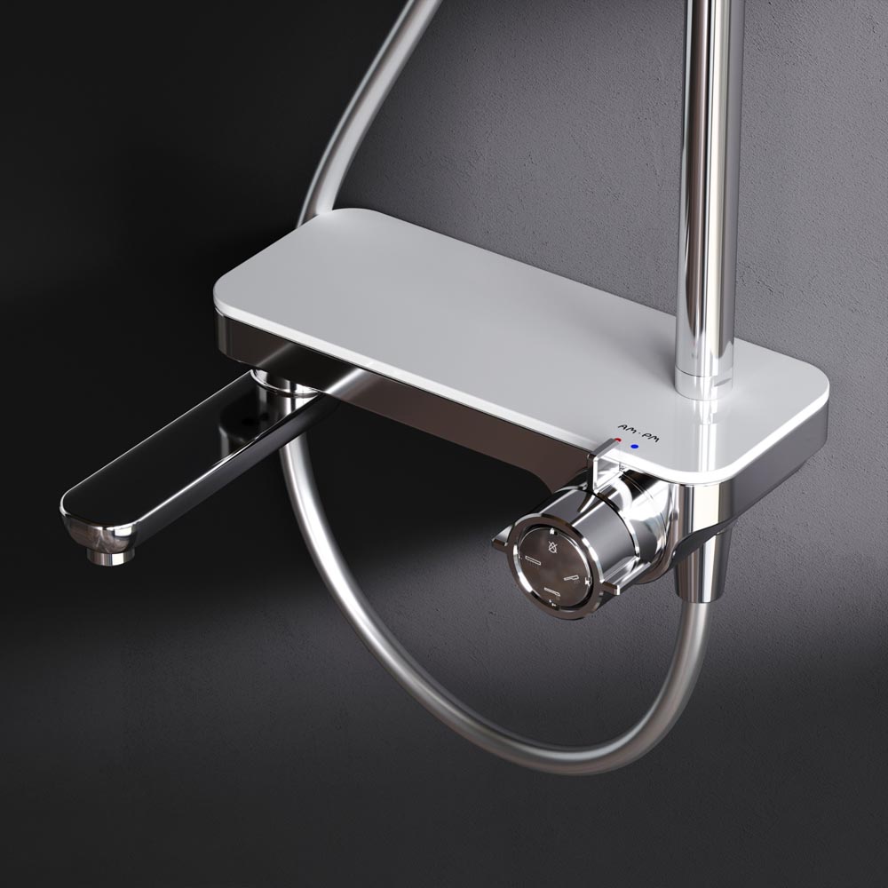 Смеситель выполнен в виде полочки. Чистый дизайн без лишних деталей: переключатель расположен за ручкой настройки температуры и позволяет менять источник потока воды от ручной лейки и излива до верхнего душа. ""