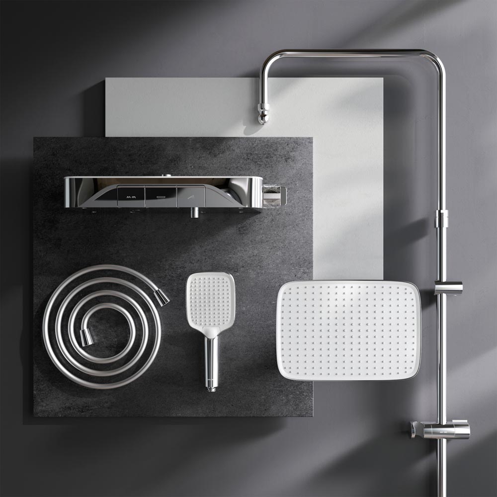 F078F200 Func, душ. система: см-ль-полка д/душа с ТМС: душ.штанга, верхн. душ квадр., ручн.душ, хром