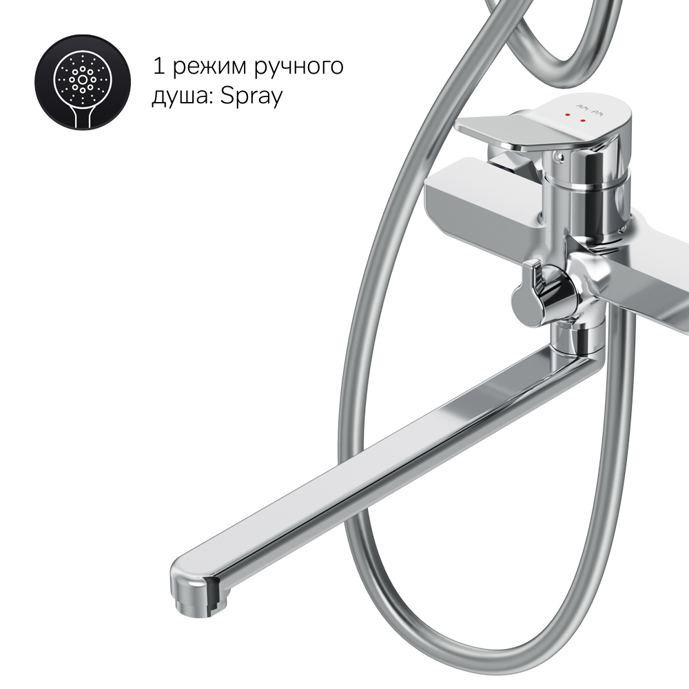 Смеситель для ванны и душа оснащен керамическим картриджем Soft Motion 35мм который обеспечивает оптимальную регулировку температуры а также выдерживает перепады давления. Излив длиной 300мм облегчит выполнение бытовых задач. ""
