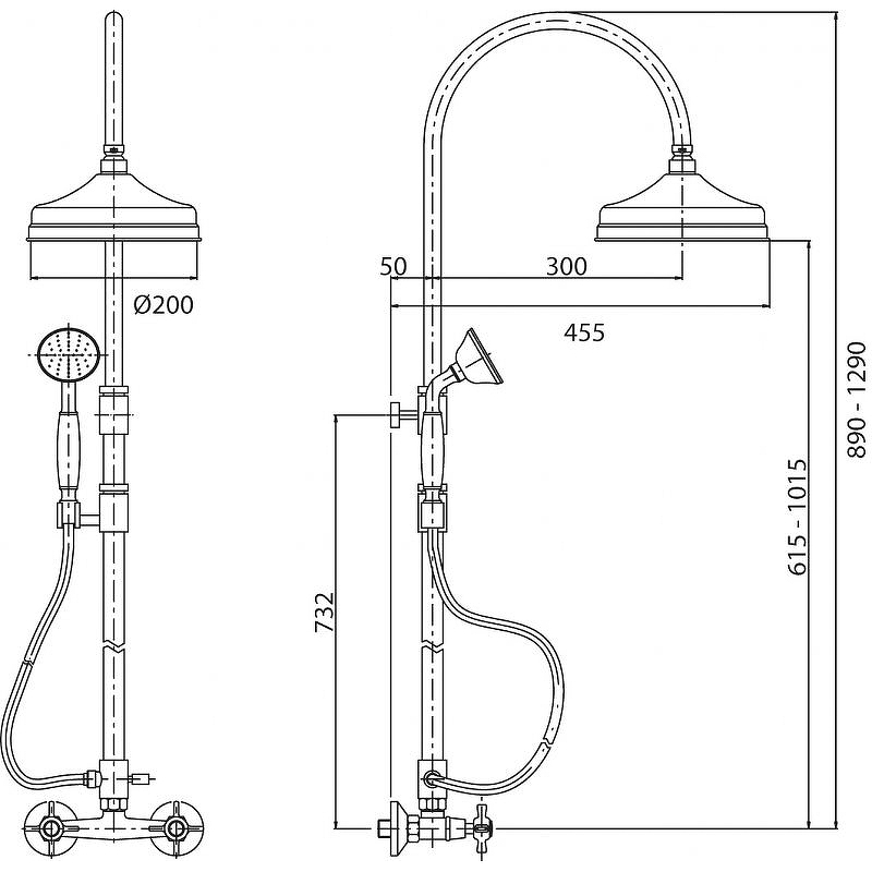 - Регулируемая по высоте душевая штанга: 890-1290 мм.