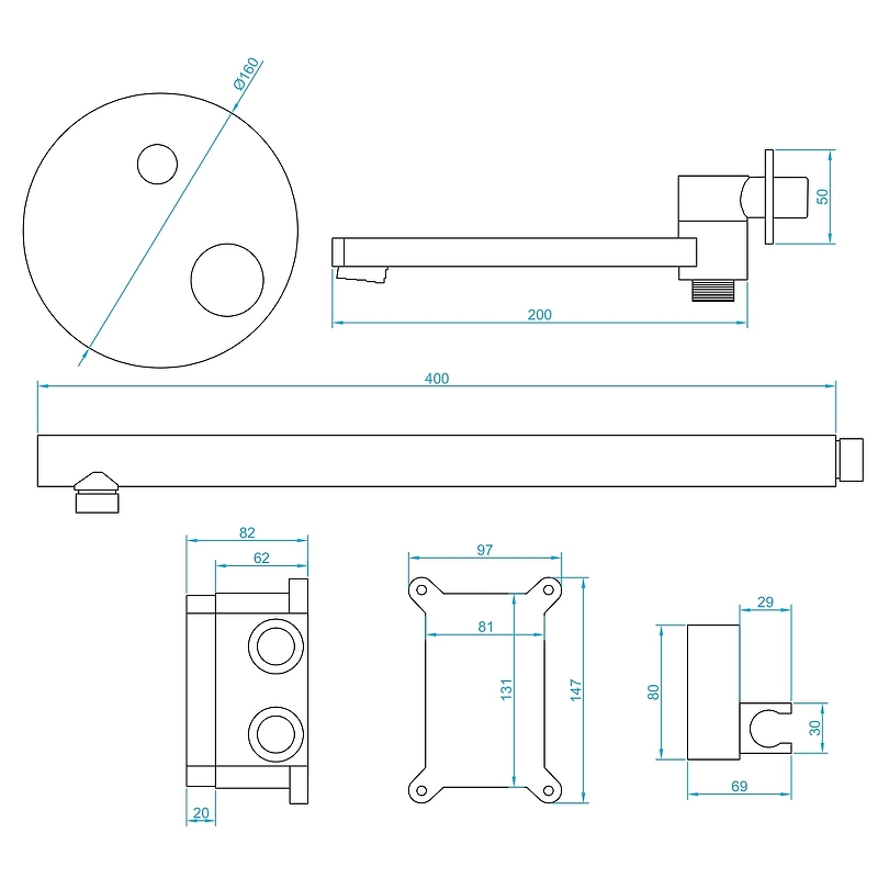 - Головной душ и горизонтальный держатель из нержавеющей стали.