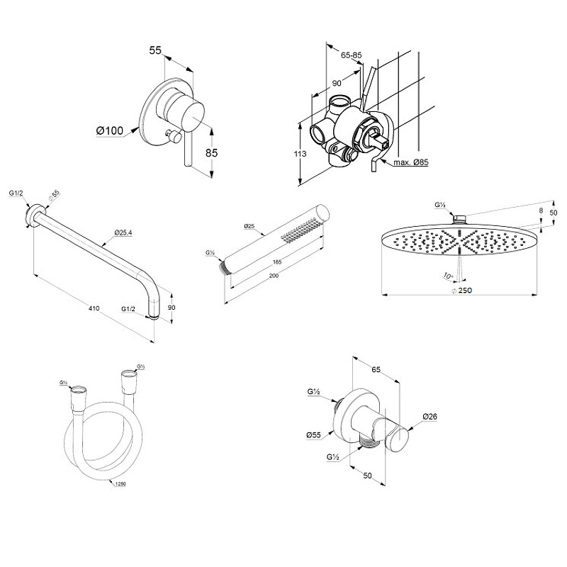 - Диапазон регулировки верхнего душа: 10 градусов.