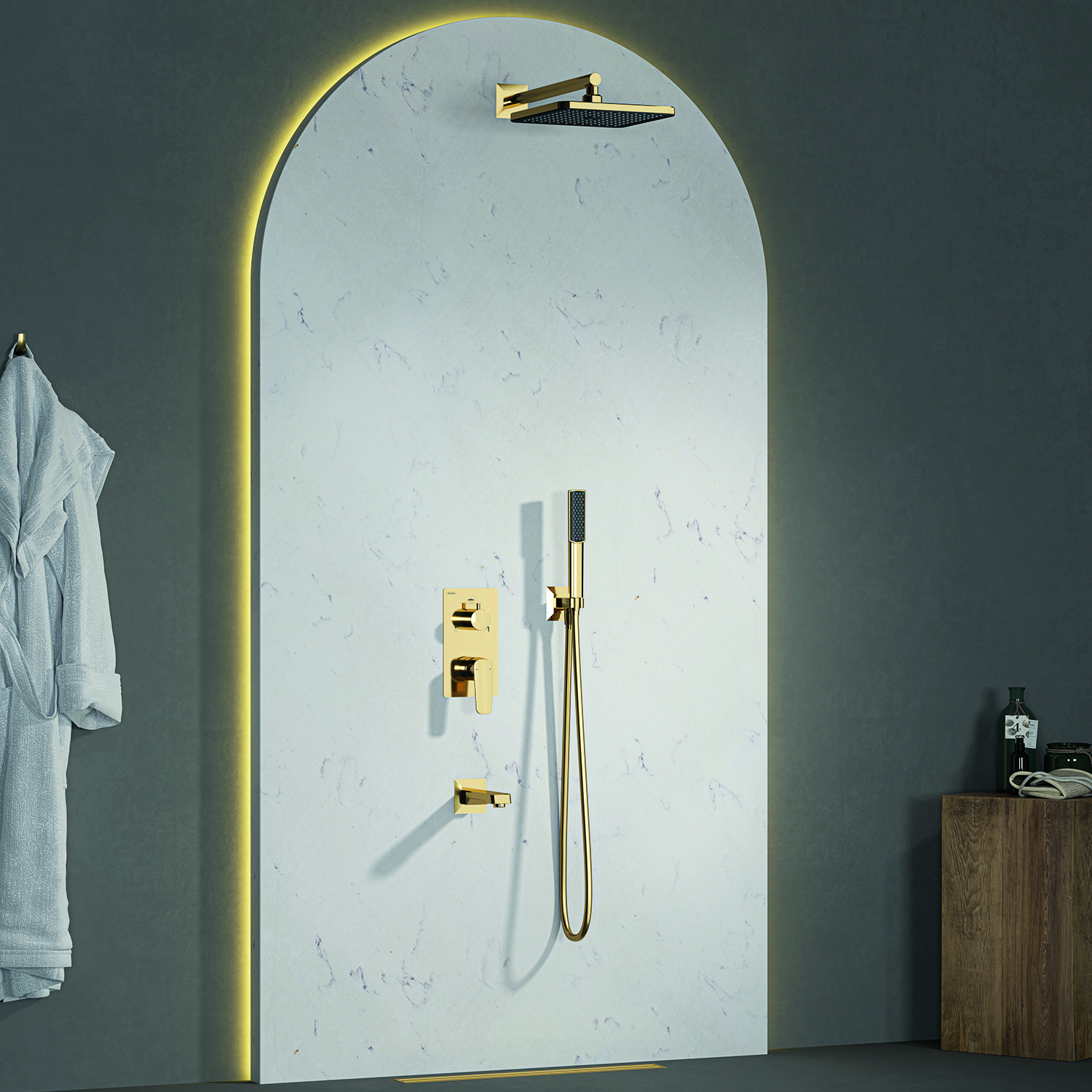 Втраиваемый смеситель Ciera с душевой лейкой и головным душем, золото