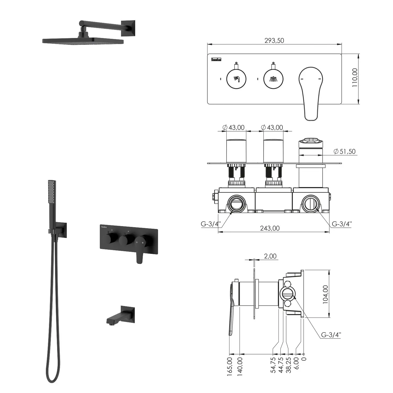 Втраиваемый термостатический смеситель Euro X с душевой лейкой и головным душем, хром