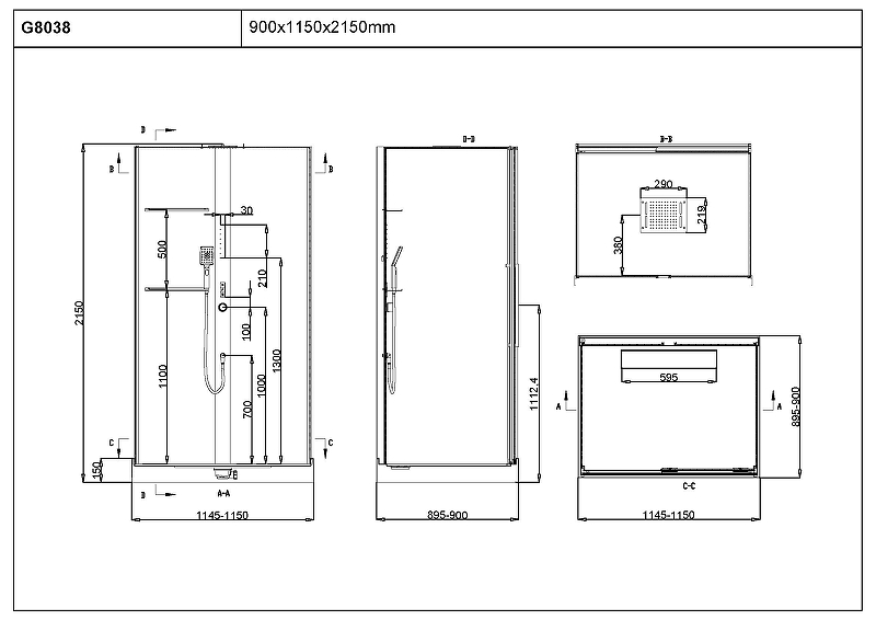 - Габариты душевой кабины (ШхВхД): 1150х2150х900 мм.