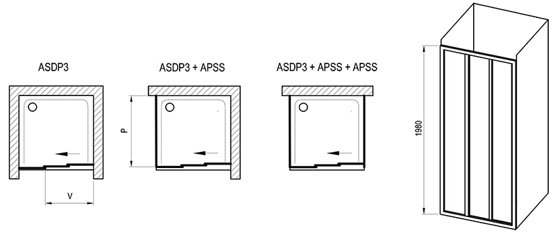 Изделие состоит из одной неподвижной и двух подвижных частей. Перевернув изделие на 180 градусов, получите левый/правый варианты входа. Устанавливается в облицованный кафелем угол ванной комнаты на поддон или непосредственно на пол со встроенным душевым каналом.