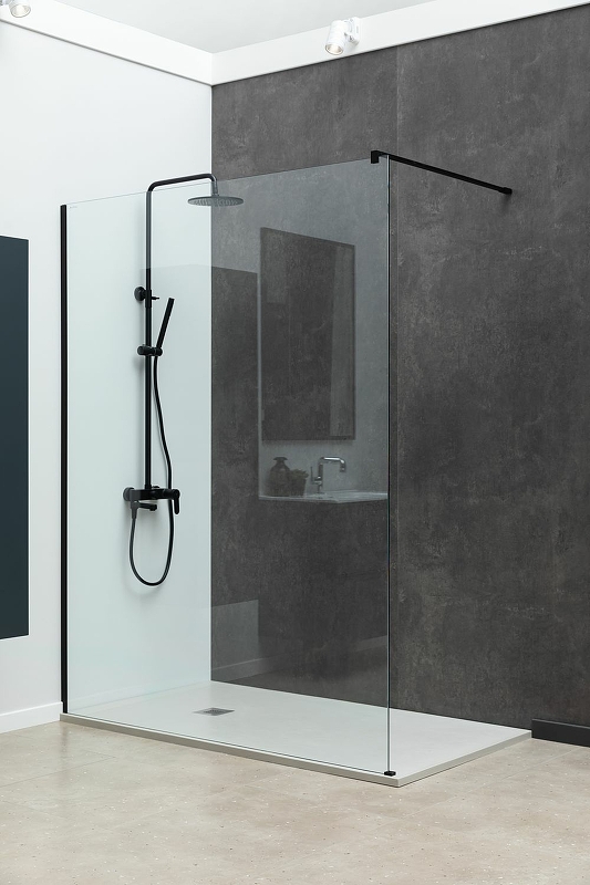 - Фиксация на 3 точки: пристенный профиль, крепление к полу или поддону, суппорт к стене.
