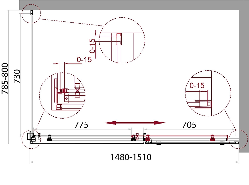 - Регулировка ширины предусмотрена за счет боковых профилей, что позволяет без проблем установить изделие даже при кривизне стен.