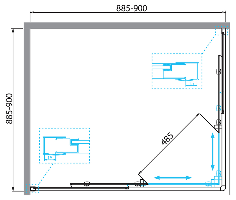 - Регулировка ширины за счет боковых профилей: (88,5-90)x(88,5-90) см.