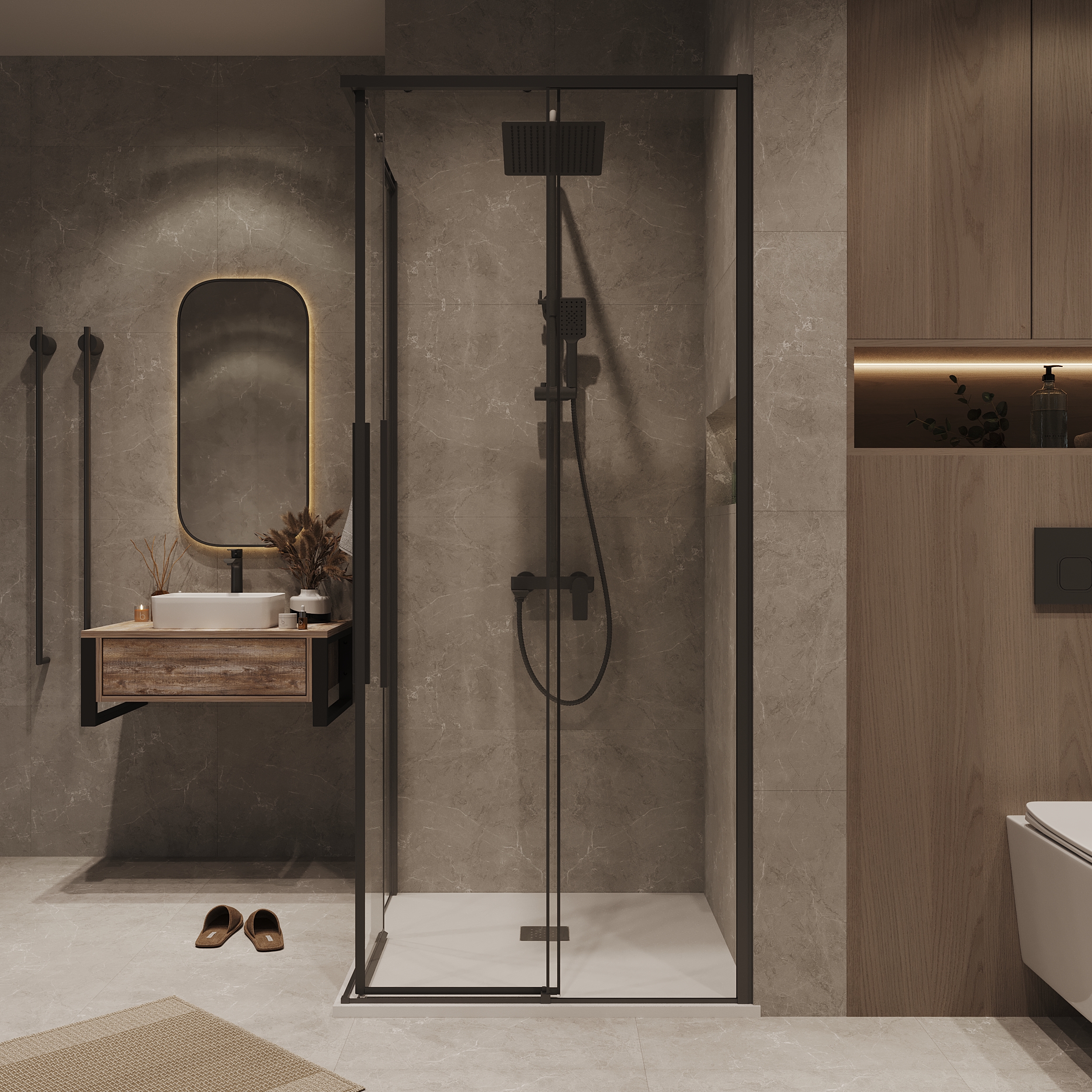 Душевое ограждение Grossman 1/2 круга арт. №K33.01.70.21.00-1/2.K33.01.70.21.00 (70х70х195 cm) дверь раздвижная, черный матовый, стекло прозрачное, 2 места: Форма: Квадратная