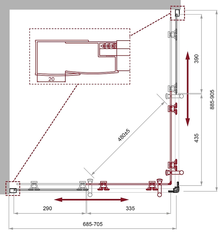 - Регулировка ширины предусмотрена за счет боковых профилей, что позволяет без проблем установить изделие даже при кривизне стен.