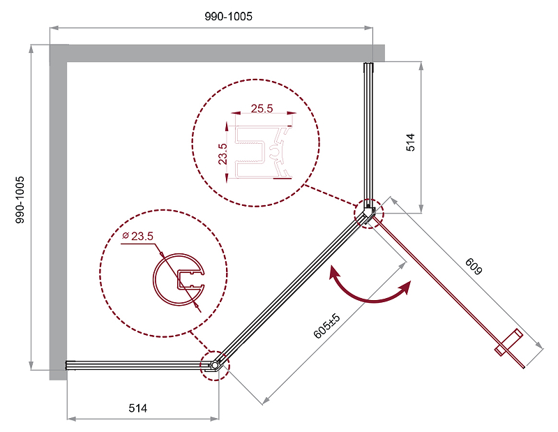 - Размеры с диапазоном регулировок (ШхД): 990-1005х990-1005 мм.