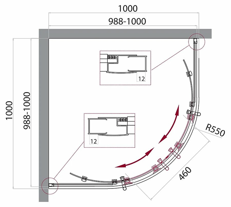 - Регулировка ширины предусмотрена за счет боковых профилей, что позволяет без проблем установить изделие даже при кривизне стен.