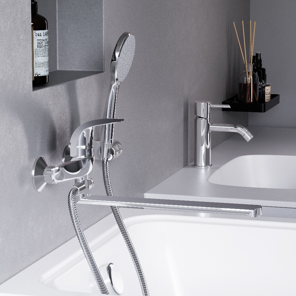 Классический вариант смесителя для ванны и душа будет аккуратно смотреться в интерьере из-за округлых форм и сглаженных углов. Длинный излив смесителя поможет справится с рядом бытовых задач его длина составляет 387 мм.