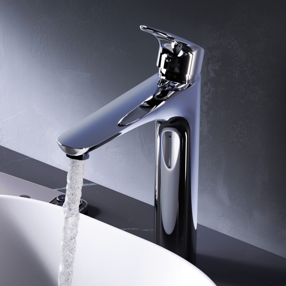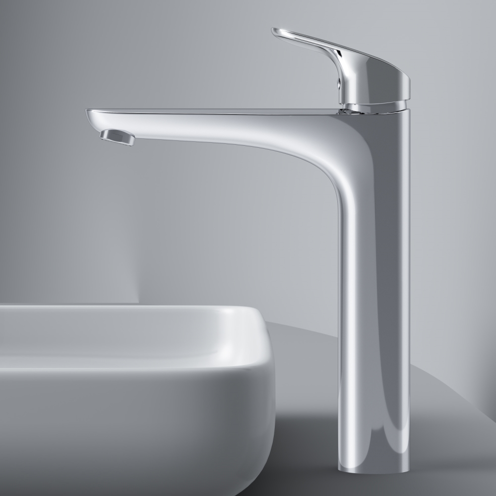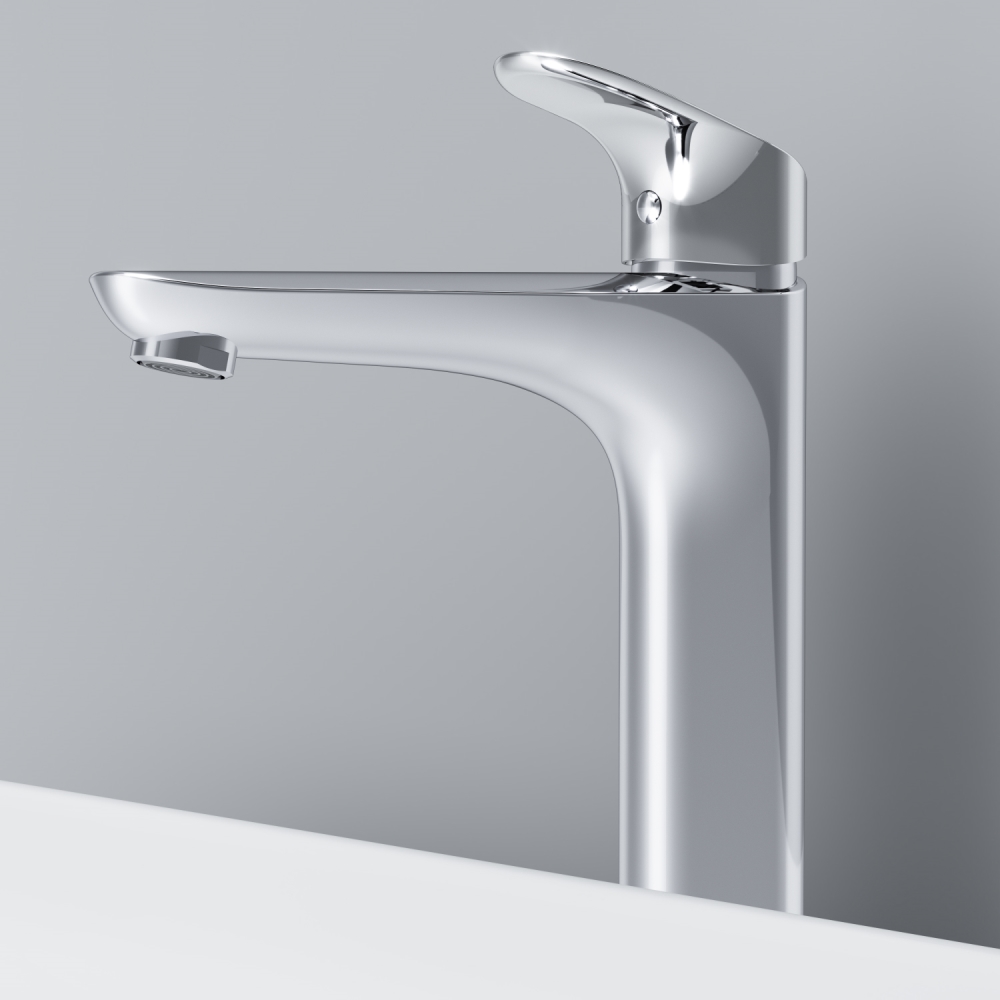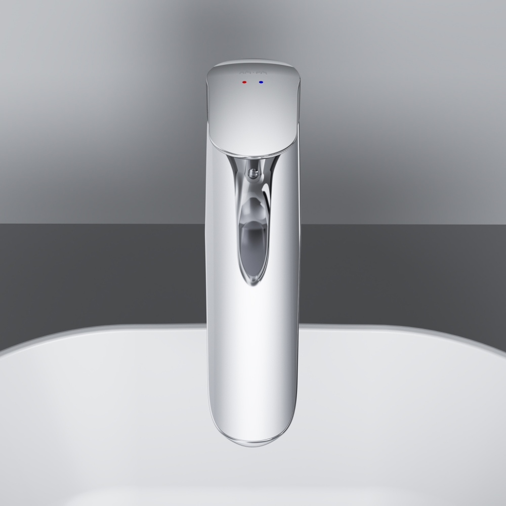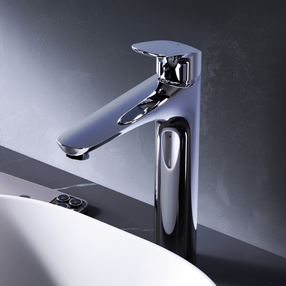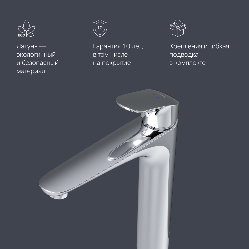 Высокий излив придает смесителю утонченный вид и идеально подойдет для раковины с глубокой чашей а благодаря обширной зоне движения ручки управлять температурой воды еще проще.
