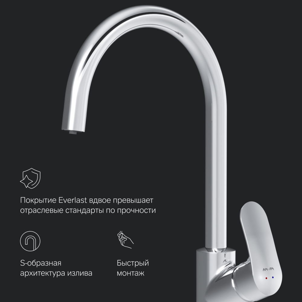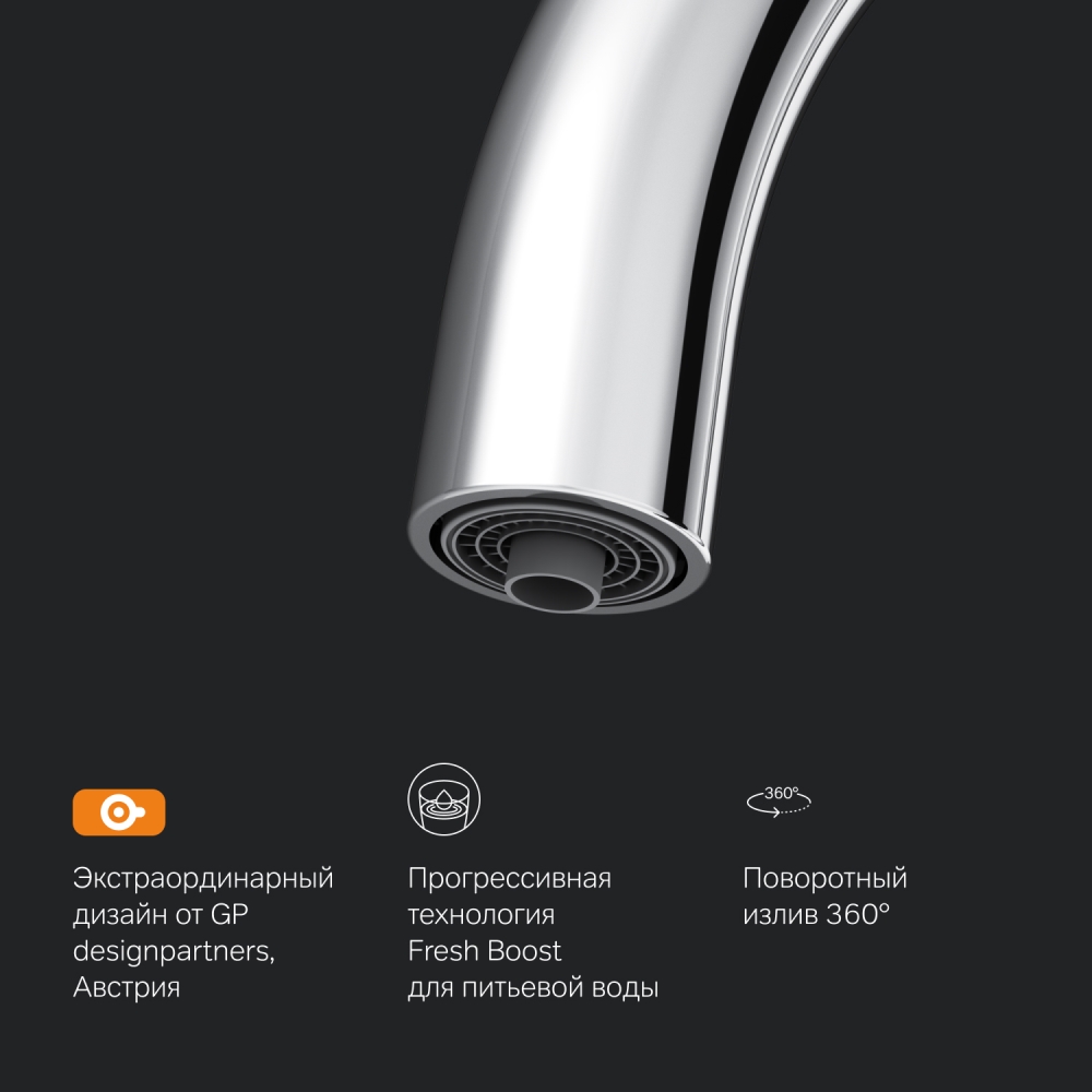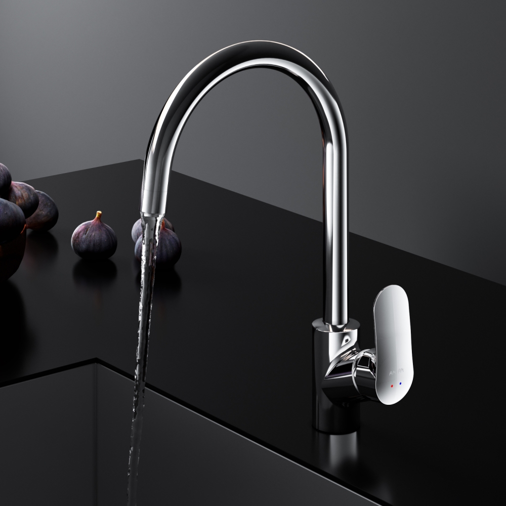 Кухонный смеситель АМ.РМ со встроенным каналом для питьевой воды успешно совмещает в себе два в одном. Благодаря прогрессивной технологии Fresh Boost при вращении ручки на 90 градусов вы можете наслаждаться чистой водой из фильтра. Если же Вам нужна обычная вода смеситель управляется привычным способом. Также конструкция совмещающая в себе 2 в 1 экономит место и придаёт кухне опрятный вид без лишних элементов.