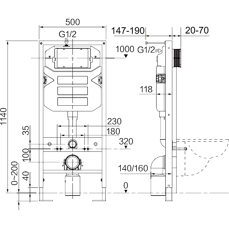 - Размеры (ШхВхГ): 500 х 1140 х 260 мм.
