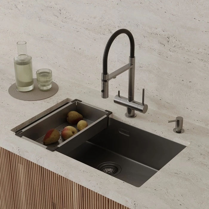 • Идеально подходит для моек IDDIS® с шириной чаши 350-425 мм, глубиной от 110 мм и длиной от 240 мм. Отлично сочетается по цвету с графитовыми смесителями и мойкой.