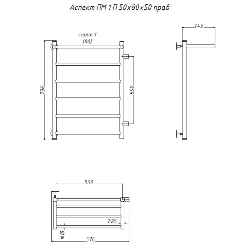 Водяной полотенцесушитель Тругор Аспект 1 П ПМ R 80x50 с полкой хром - это надежное и функциональное решение для вашей ванной комнаты.<br/><br/>Полотенцесушитель изготовлен из пищевой нержавеющей стали марки AISI 304, которая отличается высокой стойкостью к коррозии и высоким температурам. Толщина стали составляет 2 мм, что гарантирует прочность и долговечность изделия.<br/><br/>Форма полотенцесушителя - лесенка, с 8 перекладинами. Ориентация подключения - правая. Межосевое расстояние составляет 50 см, что позволяет разместить на нем большое количество полотенец или одежды.<br/><br/>Рабочее давление полотенцесушителя составляет 10 атм, а давление испытаний - 25 атм. Максимальная температура теплоносителя может достигать 110 градусов, что обеспечивает быстрый и эффективный нагрев.<br/><br/>В комплекте поставки вы найдете полотенцесушитель, телескопические держатели (2 шт.), кран Маевского и гарантийный талон.<br/><br/>Выбирая водяной полотенцесушитель Тругор Аспект 1 П ПМ R 80x50 с полкой хром, вы получаете стильное, надежное и функциональное решение для вашей ванной комнаты.