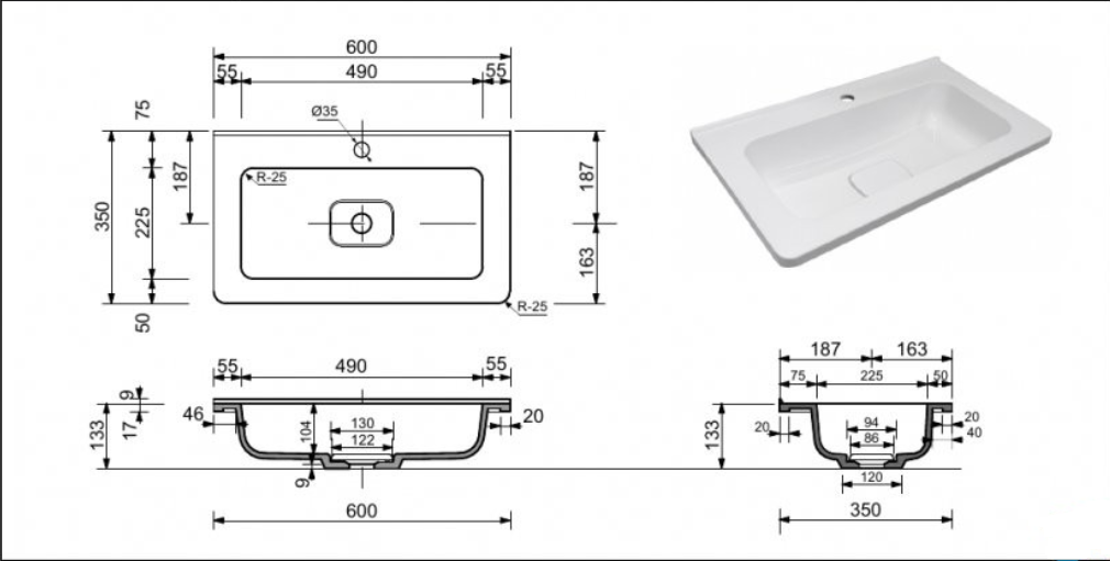 Российская раковина для мебели Style Line Каре 60 Люкс mini 60х35