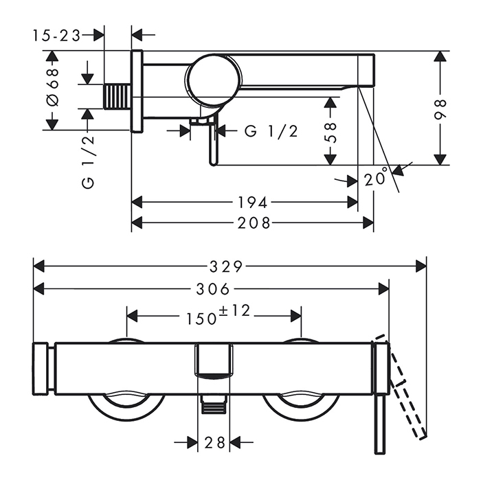 HANSGROHE FINORIS Смеситель для ванны настенный, однорычажный, цвет хром