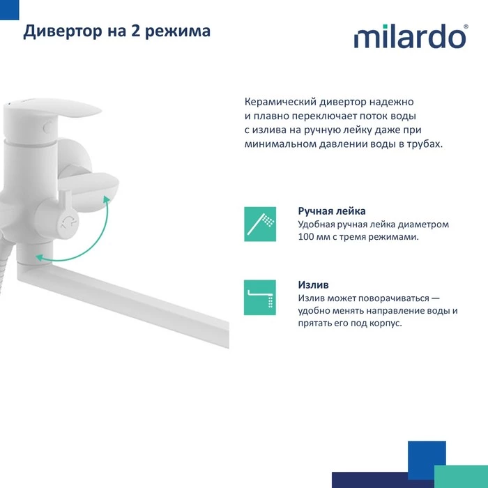 • Гарантия на смеситель Milardo® – 7 лет, на картридж – 3 года, на душевые аксессуары – 1 год.