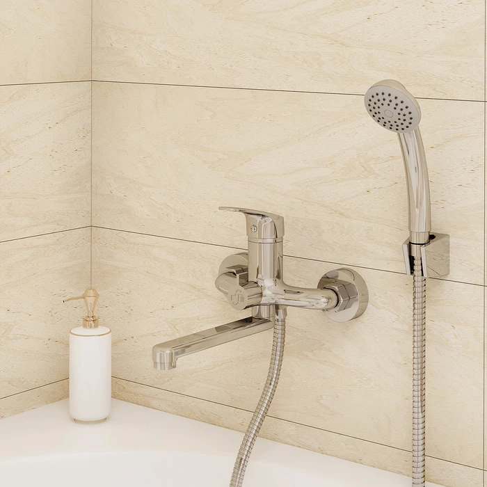 Смеситель для ванны Simp отличается простотой формы и естественной плавностью линий и подойдет для любого интерьера в классическом или современном стиле. Поворотный излив эстетично интегрирован в корпус, вода из него поступает в ванну под комфортным углом. В комплекте лейка для душа, шланг и держатель для лейки.