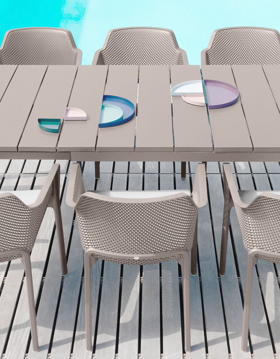 Современный дизайн и продуманный функционал станут прекрасным дополнением для патио. Изящные кресла Net подчеркнут индивидуальность пространства и помогут расставить правильные акценты. Выполненные из широких ламелей сиденье и спинка, подлокотники с плавными изгибами и оптимальная эргономика – все это позволит наслаждаться отдыхом. Раздвижной стол с яркой индивидуальностью для большой компании со столешницей из полипропилена и ножками из окрашенного алюминия гармонично дополнит пространство обеденной зоны.