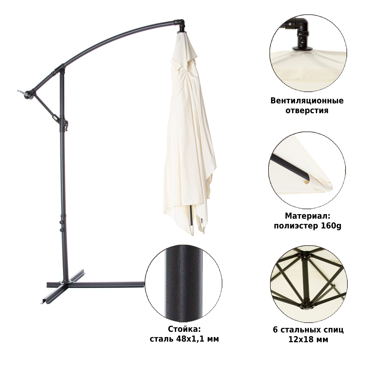 В комплекте с зонтом идет основание – крестовина, на которую для устойчивости можно установить бетонные утяжелители (в комплект не входят) или привернуть ее через имеющиеся отверстия к полу.
