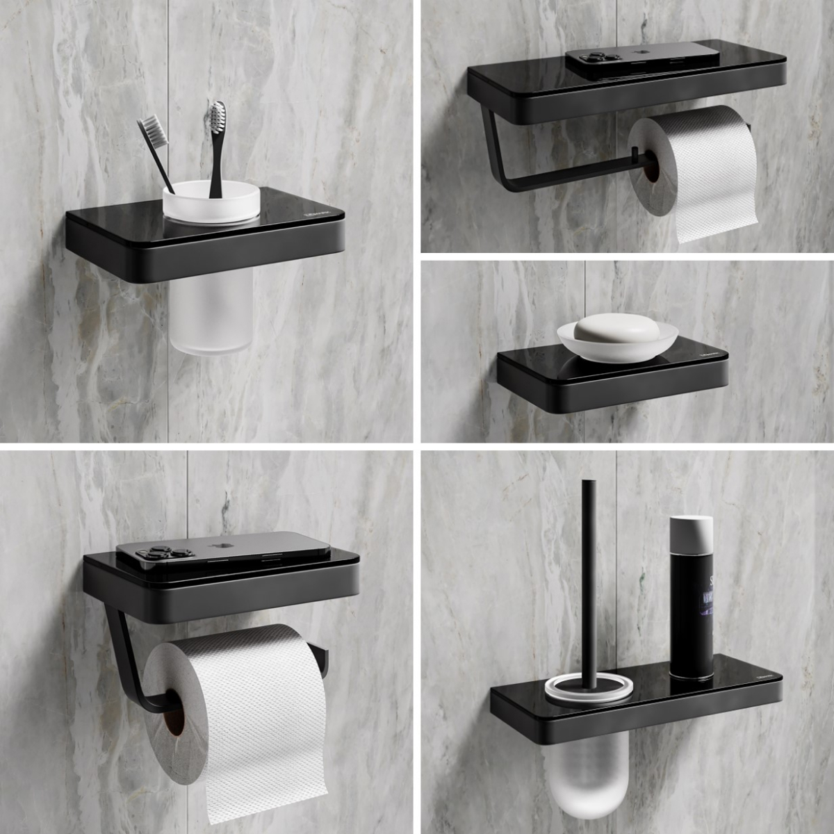 Держатель для туалетной бумаги Lemark GLASS LINE с полкой, чёрный матовый/черное стекло (9722030)