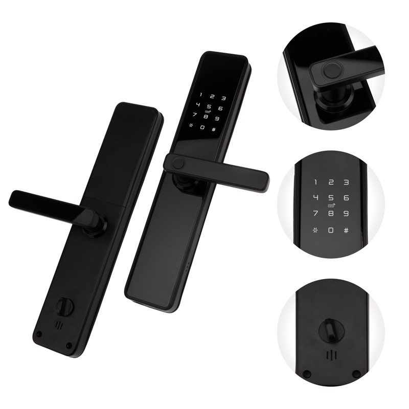 Умный замок представляет собой высокотехнологичное устройство с биометрической системой, которое позволяет открывать/закрывать входную дверь отпечатком пальца, электромагнитным ключом, ПИН-кодом или с помощью приложения.