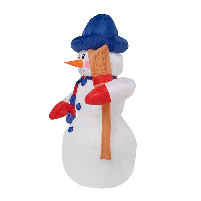 Надувная 3D-фигура «Снеговик с метлой» высотой 180 см выполнена в виде забавного доброго персонажа, который будет отлично смотреться на уличной площадке возле дома, специально оформленной террасе или в холле. Снеговик, выполненный из прочного капрона, надувается при помощи компрессора. Устройство поддерживает постоянный объем воздуха, создавая легкие колебания конструкции. 4 диода ярко освещают фигуру, которую прекрасно видно в темное время суток. Изделие защищено от влаги и пыли по стандарту IP65. В комплекте идет компрессор, крепеж и понижающий адаптер для подключения к стандартной питающей сети 230 Вольт.