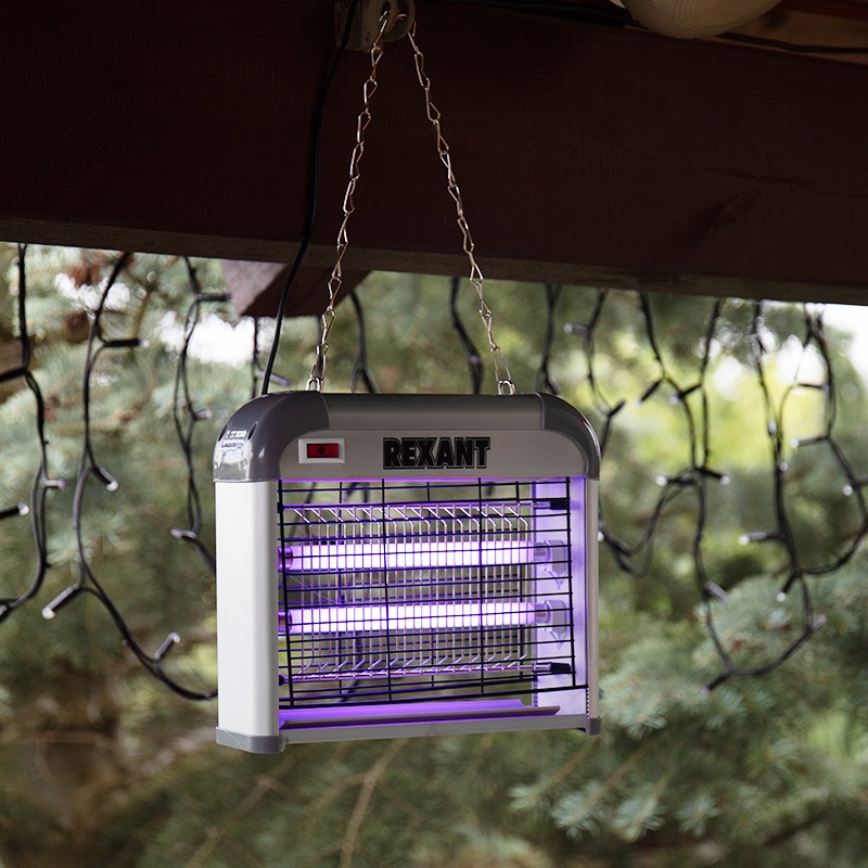 Антимоскитная лампа Rexant- современное экологически безопасное средство по борьбе с комарами, москитами, мошкой, мотыльками и другими летающими видами насекомых внутри помещения. Устройство излучает ультрафиолет и нагревается, тем самым имитирует млекопитающих животных и манит насекомых. Насекомые, подлетая, получают смертельный удар током от металлической сетки под напряжением.