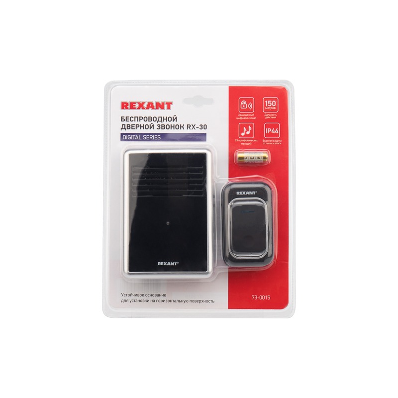 Беспроводной дверной звонок c цифровым кодированием 25 мелодий 150м кнопка IP44 (черный) REXANT RX-30
