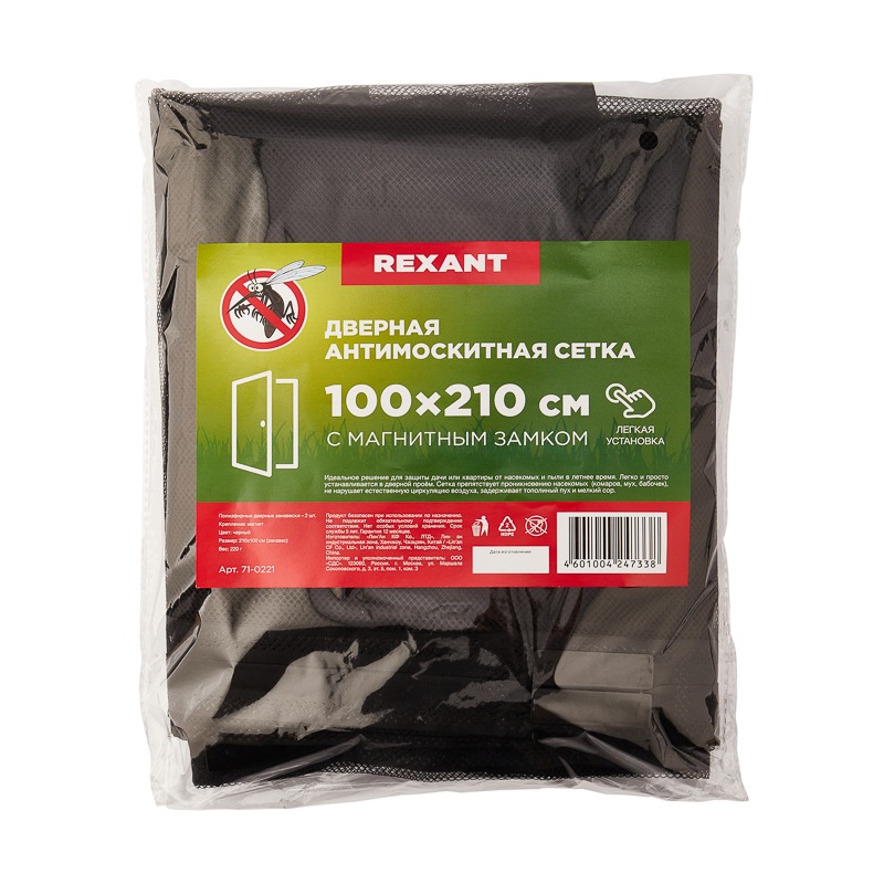 Дверная противомоскитная сетка REXANT впишется в любой интерьер и отлично справится с возложенным функционалом. В летний период проветривание помещения играет особую роль. Размер ячейки ткани магнитной сетки препятствует попаданию в комнату не только насекомых, но и пыли и других аллергенов. <br> Отличается простотой установки. Для нее потребуется всего 20-30 минут. Сетка крепится в дверной проем с помощью липучек, поэтому его поверхность нужно обязательно очистить и обезжирить. Изделие оснащено магнитной самозащелкивающейся лентой.