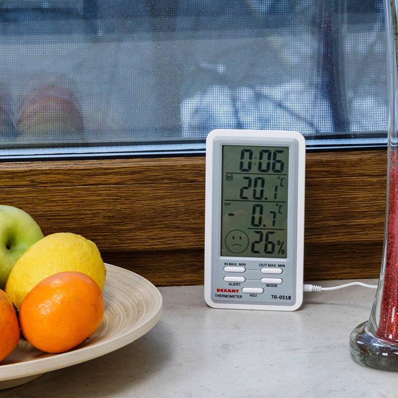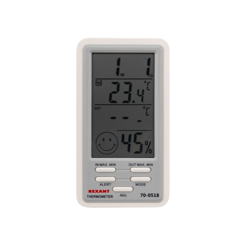 Комнатно-уличный термогигрометр с проводным выносным датчиком REXANT предназначен для измерения показаний температуры внутри и снаружи помещений, а также для измерения влажности в комнате. <br> Термогигрометр регистрирует в памяти максимальное и минимальное значения температуры, а также отображает общий уровень метеокомфорта в помещении. Для удобства использования температура может отображаться в градусах Цельсия или в градусах Фаренгейта (°C/°F).<br> На передней части корпуса расположены 3 большие кнопки управления и настройки. Сбоку находится разъем для подключения выносного датчика. <br> Благодаря подставке, термогигрометр будет удобно разместить в любом месте.<br> Корпус выполнен из гипоаллергенного качественного ABS-пластика. Длина провода выносного датчика составляет 1 м.