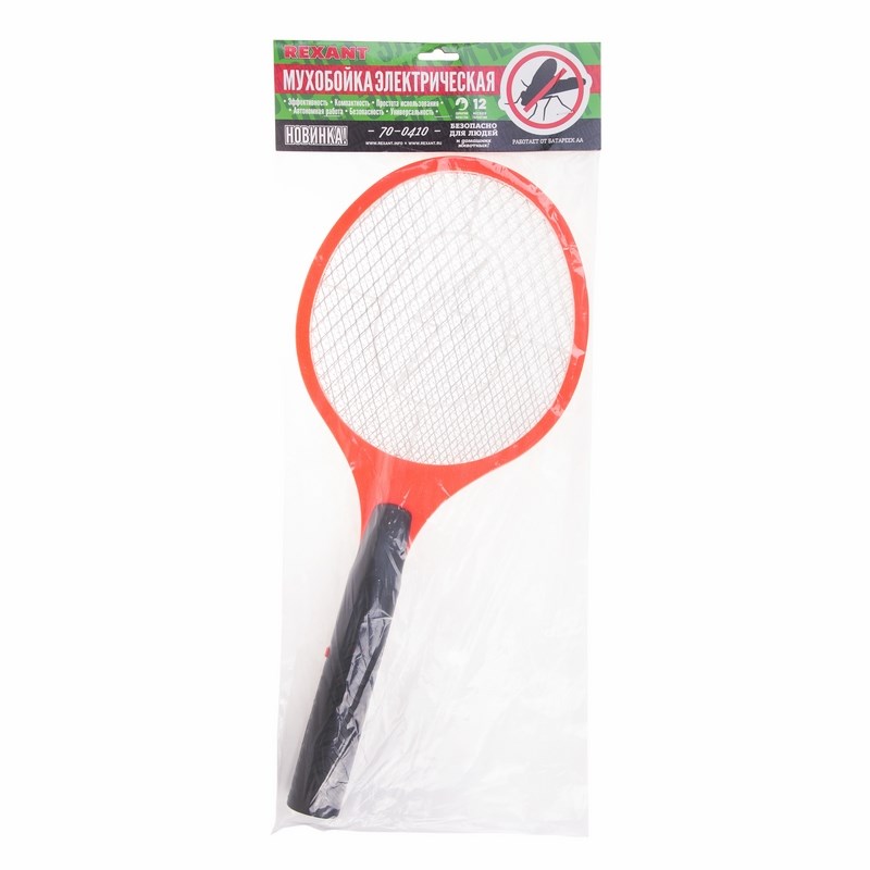 Электрическая мухобойка REXANT 0410 по внешнему виду похожа на маленькую ракетку для бадминтона. При нажатии кнопки на внутреннюю сетку подается ток, в результате насекомое при контакте с ней получает смертельный удар током.