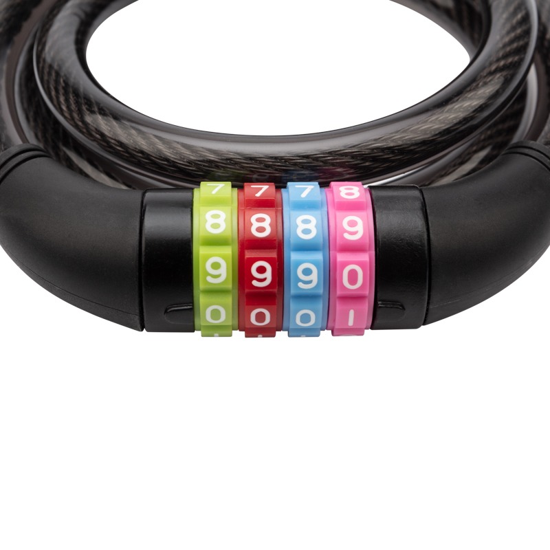 Трос в износостойкой пластиковой оболочке имеет гибкую конструкцию с надежным кодовым замком, позволяющим, при необходимости, менять комбинации, избегая потери ключей, в отличие от моделей со стандартными замками.