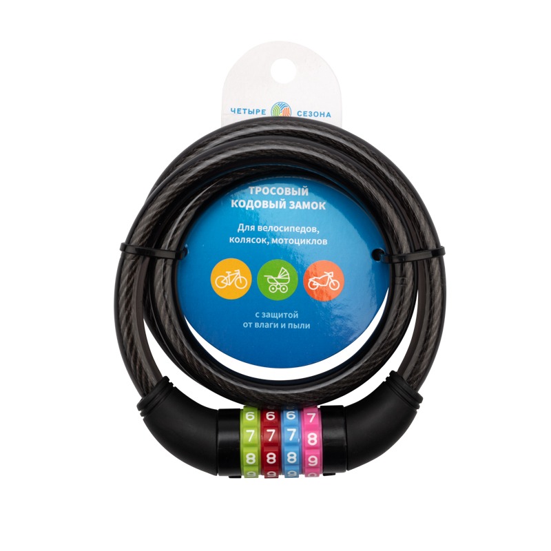Тросовый кодовый замок ЧЕТЫРЕ СЕЗОНА – недорогое и надежное средство от кражи велосипедов, мопедов, колясок, рекламных щитов, вывесок и другого имущества. Отличается простой конструкцией, удобством транспортировки и высокой степенью стойкости к взлому.