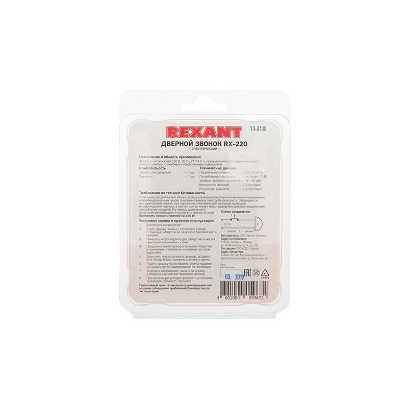 Звонок электрический без кнопки 1 мелодия 220 вольт REXANT