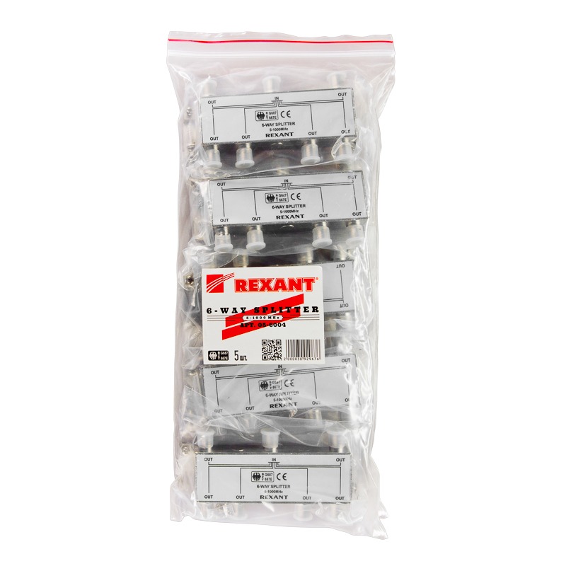 Телевизионный делитель это удобное средство для разделения сигнала на несколько равных частей. Антенные делители, также называемые телевизионные сплиттеры ,часто используются когда требуется подключить один телевизионный кабель, идущий от антенны, сразу к нескольким телевизорам. Особенно это актуально в многокомнатных квартирах или многокомнатных загородных домах. Делитель имеет один вход под F разъем и шесть выходов, также под F разъемы. Сигнал, подающийся на вход делителя, делится на шесть равных частей и передается на выходы. Для подключения кабелей используются стандартные F-разъемы. Полоса пропускания делителя от 5 до 1000МГц, эти частоты используются для стандартного эфирного телевидения. Качественно изготовленный ТВ сплиттер REXANT долго и надежно прослужит в составе телевизионной системы, делая удобной эксплуатацию нескольких телевизоров.